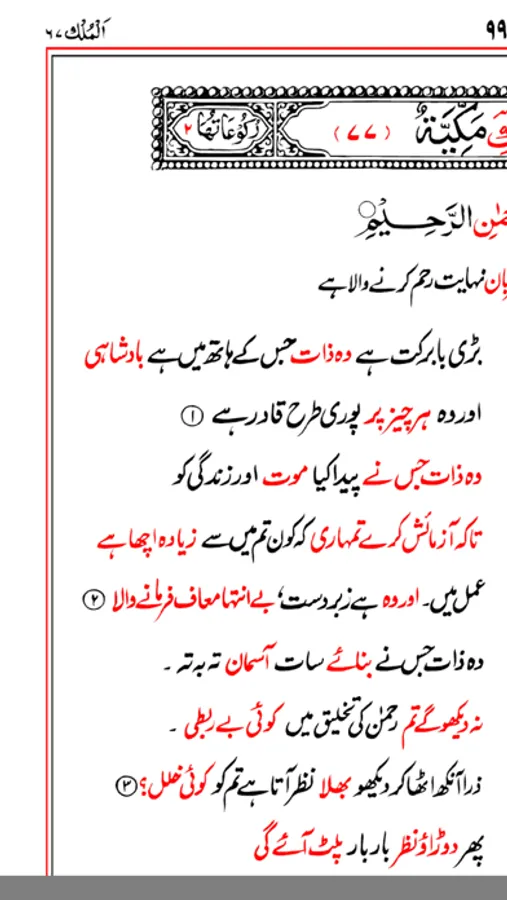 Quran Asan Tehrik® has, compiled translation of Quran-e-Hakim in two colors, the Arabic word written in a colour bears it’s meaning in the same colour, the text and the translation go side-by-side together on a page, making it extremely easy to ascertain which Arabic word means what. This method provides the reader an easy understanding of the Arabic as a language and also builds up potential of the reader to comprehend Quran-e-Hakim directly without the aid of any exterior help.
