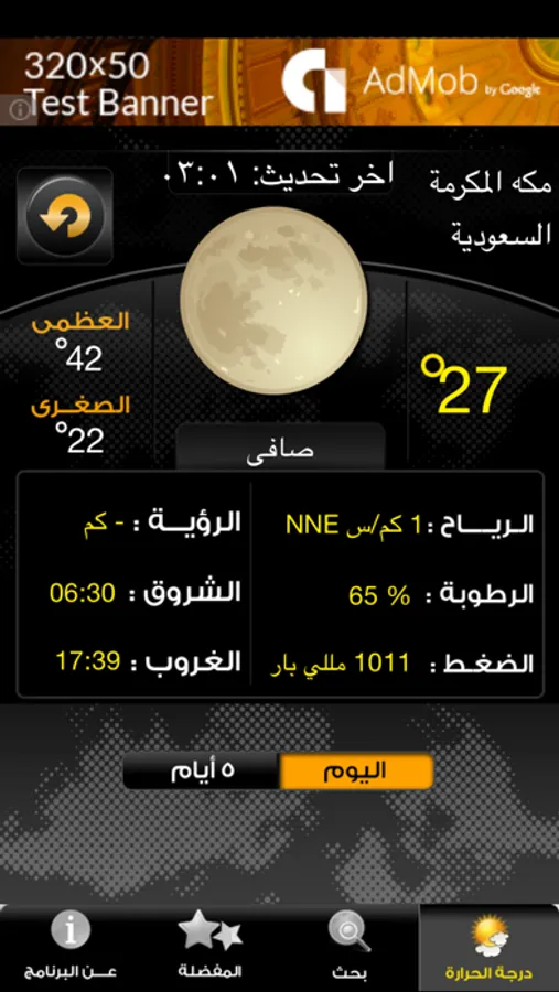 ١. عند البدء يقوم البرنامج بتحديد مكان المستخدم لعرض توقعات درجات الحرارة والتى تحتوى على درجة الحرارة و حالة الطقس و نسبة الرطوبة و اتجاه الرياح الآن كما يحتوى على درجة الحرارة العظمى و الصغرى و حالة الطقس لكل من اليوم و خمس أيام تالية .
