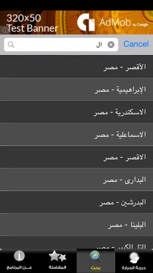 ٢. صفحة البحث و تمكنك من البحث عن المدن المتاحة , و عند اختيارك لمدينة يتم إضافتها للمفضلة و يتم عرض حالة الطقس لها.