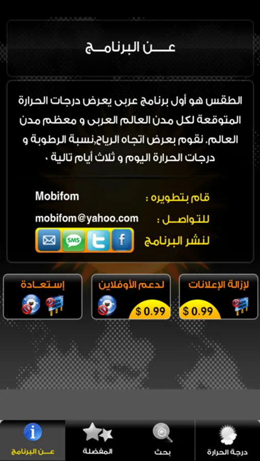 ٤. عن البرنامج و تحتوي علي بعض الوسائل المساعدة في نشر البرنامج مثل الفيس بوك - تويتر - الرسائل النصية القصيرة - البريد الالكتروني كما تحتوي علي بعض الخصائص الاضافية والتي يمكن شراؤها وهي:-