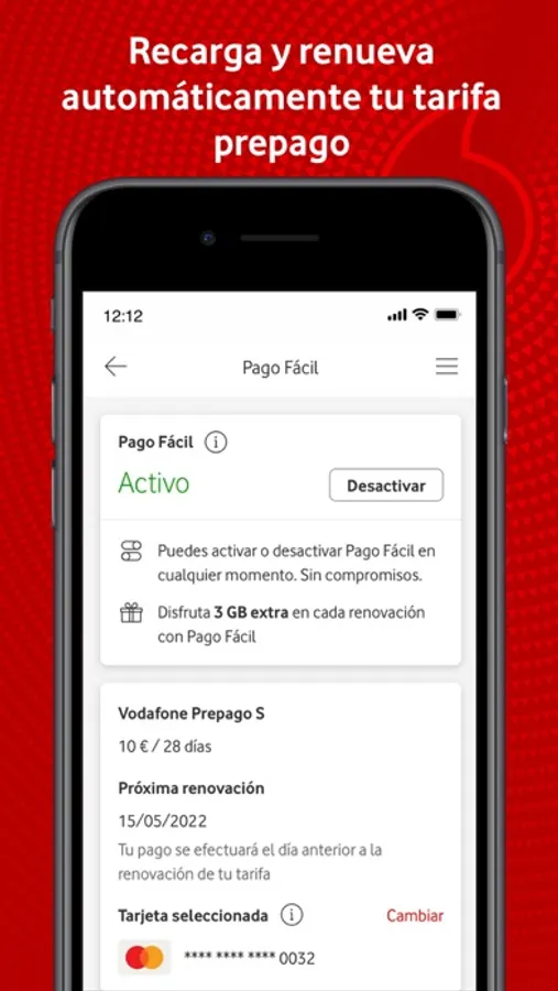 - Ya no tendrás que ir físicamente a ningún sitio para recargar, ¡olvídate! Desde Mi Vodafone podrás hacerlo fácilmente, ¡podrás incluso programar tus recargas para que mes a mes se hagan de forma automática con el servicio “Pago Fácil”!