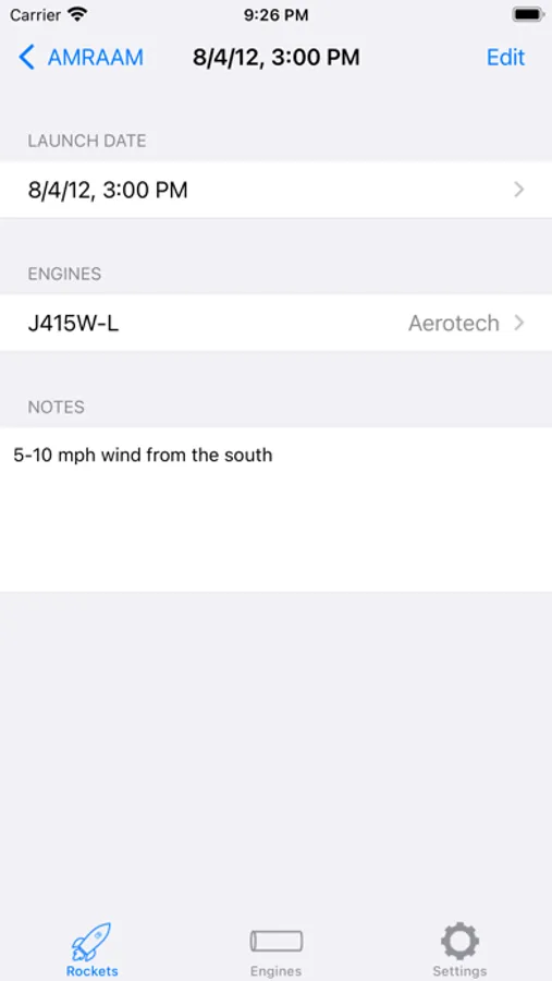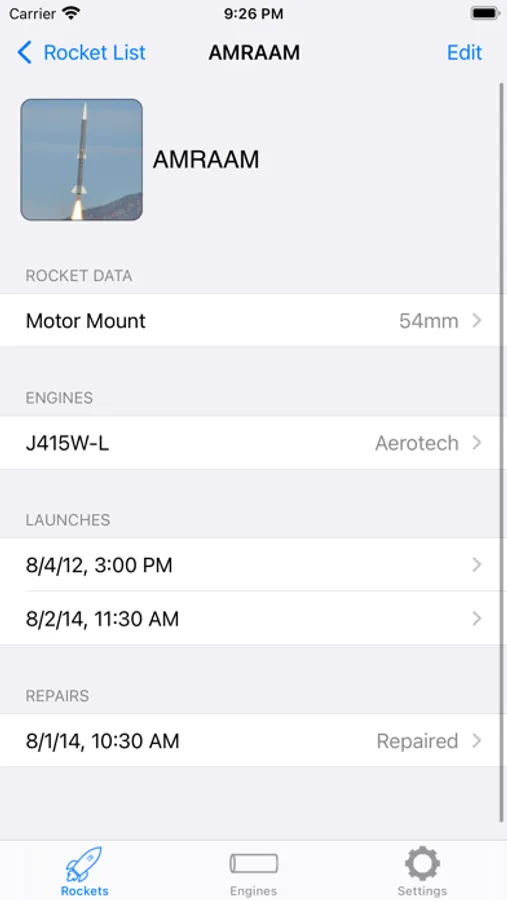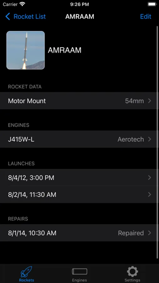 Rocket Tracker is an app used to keep track of the rocketeer's collection of model and high-power rockets. It can be used to keep track of a rocket's physical characteristics (height, weight, center of gravity, etc.), what engines it can use, when it has been launched and what engines were used for that launch, and what repairs it may need.
