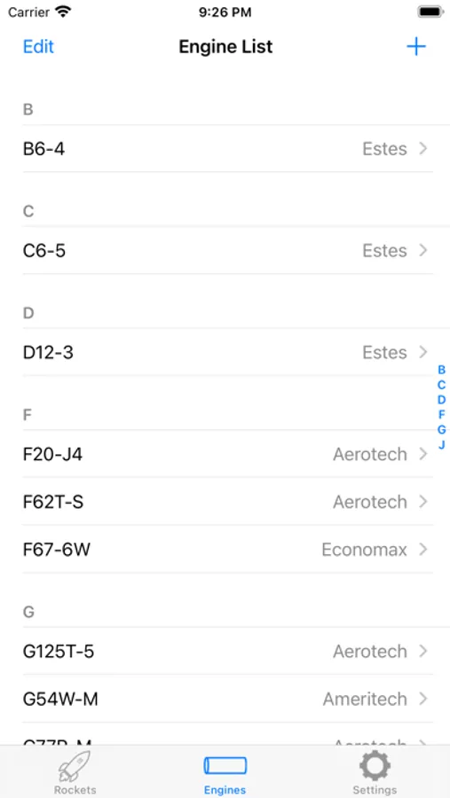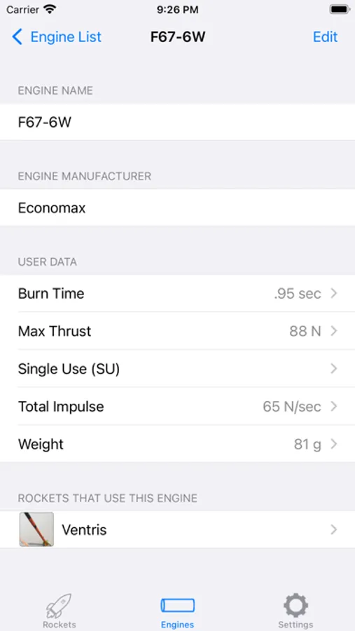 In addition, Rocket Tracker keeps a list of all engines used by any of your rockets and will list all of your rockets that can use a given engine. This is especially helpful when you have a couple of engines laying around and want to know which of your rockets could use those engines.