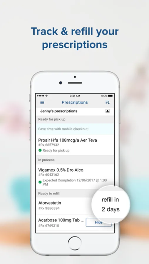 View all your prescriptions in a list along with prescription number, dosage, fills left and expiration. You can also quickly scan the label on your prescription bottle to order a refill instantly.
