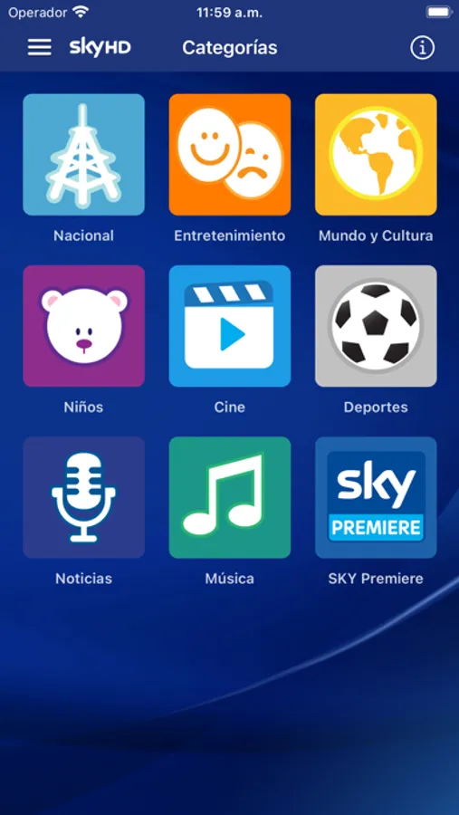 Para que no extrañes los mosaicos, la vista de categorías te proporciona de manera organizada la programación de los canales de tus géneros preferidos HD, Cine, Deportes, Entretenimiento, Música, Mundo y Cultura, Nacional, Niños y Noticias.
