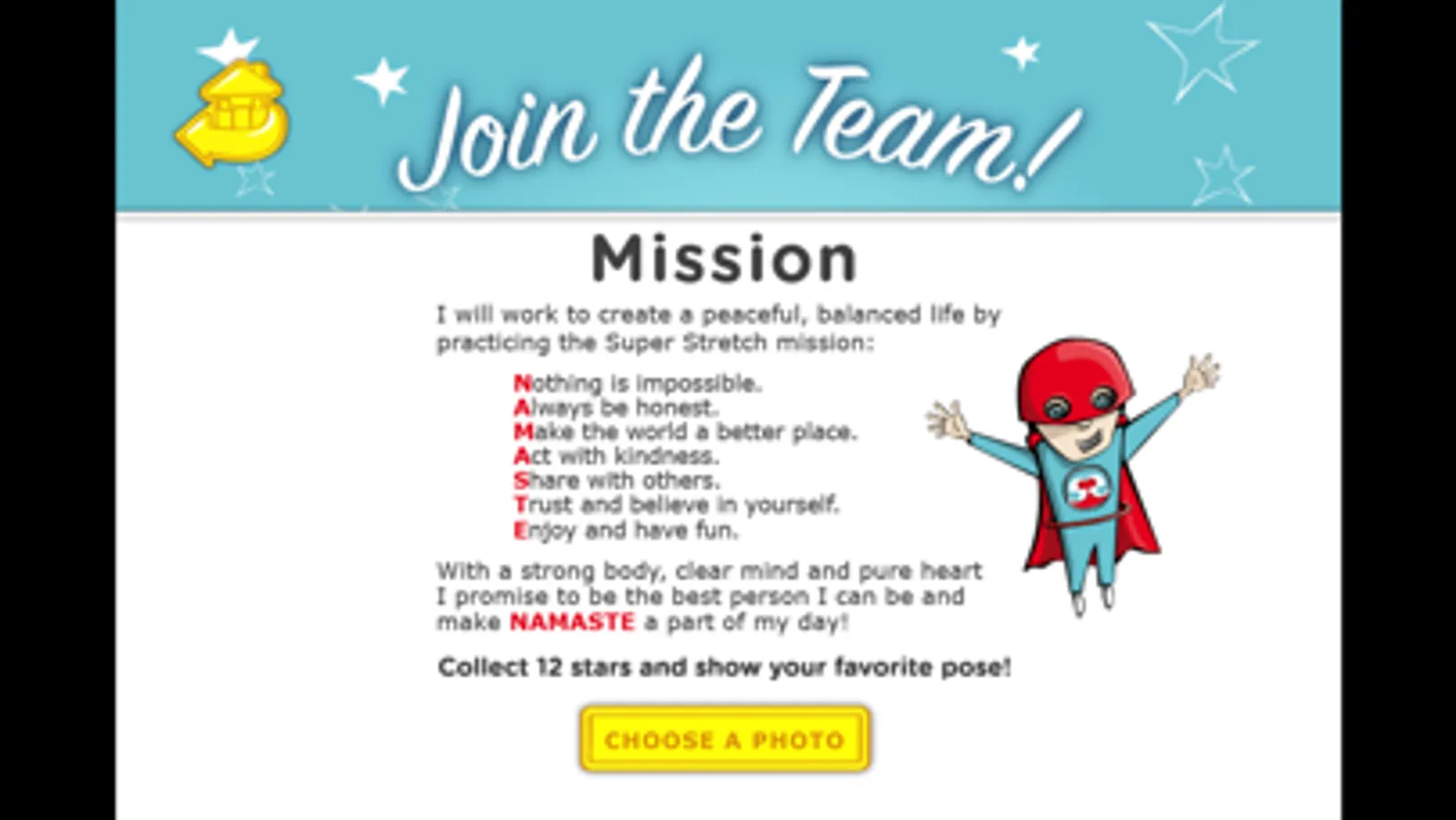 Using storytelling, animation and video examples, kids enjoy making NAMASTE a part of their day. NAMASTE is The Adventures of Super Stretch’s secret code to help kids learn to find balance and strength in their lives. Be the best you can be! Practice poses, collect 12 stars and get a team photo. Each of Super Stretch's friends helps us learn how to use movement and breathing to make every day balanced. Then, real-life kids demonstrate the pose. So easy and entertaining we forget that it’s exercise.