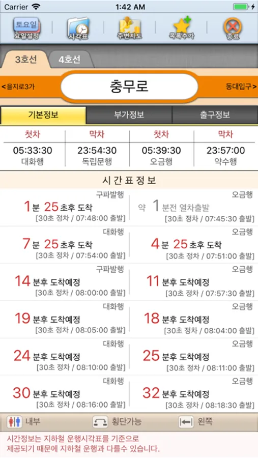 현재 앱에 적용된 시간표는 각각의 메트로 사이트에 개제되어 있는 시간표에 맞추고 있습니다. 여러가지 요인으로 인하여 연착되는 경우 시간표와 열차 도착시간이 다를수도 있습니다.