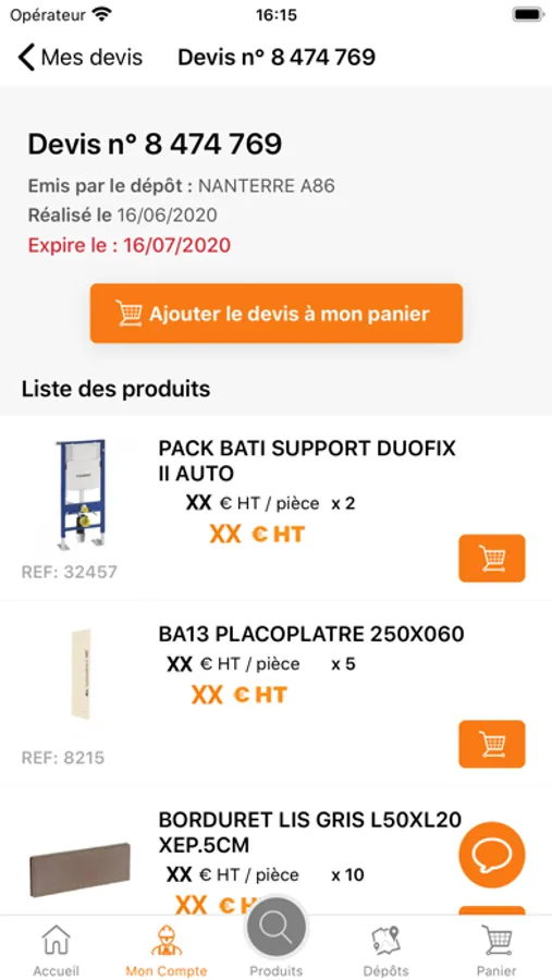 - Dans votre compte, retrouvez tous vos documents : devis en cours, listes, factures, commandes, adresses, chantiers, ... Et transformez vos devis et vos listes en commande depuis votre chantier !