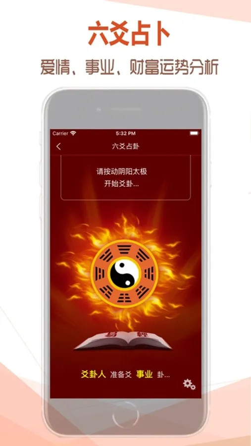 APP提供了事业,经商,求名,外出,婚恋,决策,运势分析,爱情,健康,疾病,失物,诉讼,求官,求财,升学,婚姻,求职,行人,出行,拜访,交易,今日运势,气运,家运,买卖,交易,开业,拜访,改行,资金周转,子女,家宅,胎孕,求事,考试,旅游,寻人,官司,等人等等众多事项爻卦。