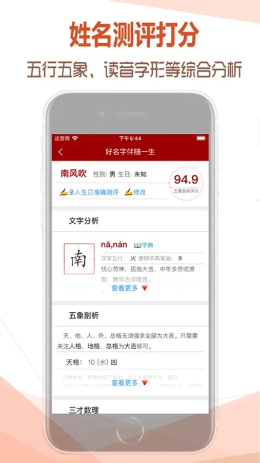 * 姓名文字分析、听觉效果、五行平衡、三才数理、五象剖析
