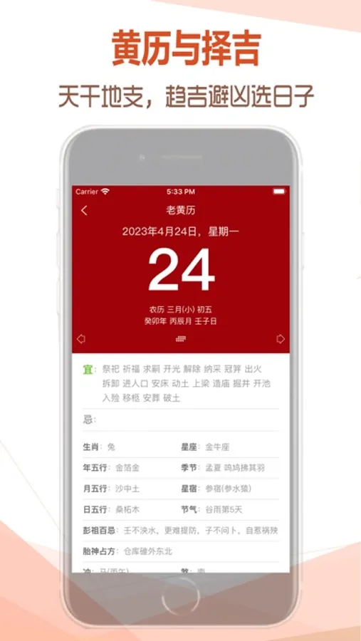 app提供老黄历,用户可查询任意日期的老黄历。系统支持老黄历的分享。