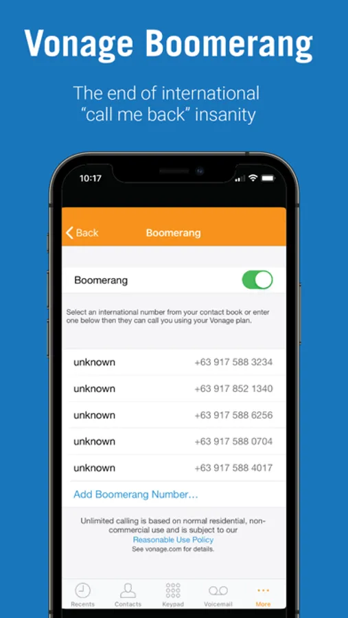 • Boomerang - for international callers. No more missed call & callback frustration. Automatically connects to selected contacts using YOUR Vonage VoIP number - at no charge to them! (New)
