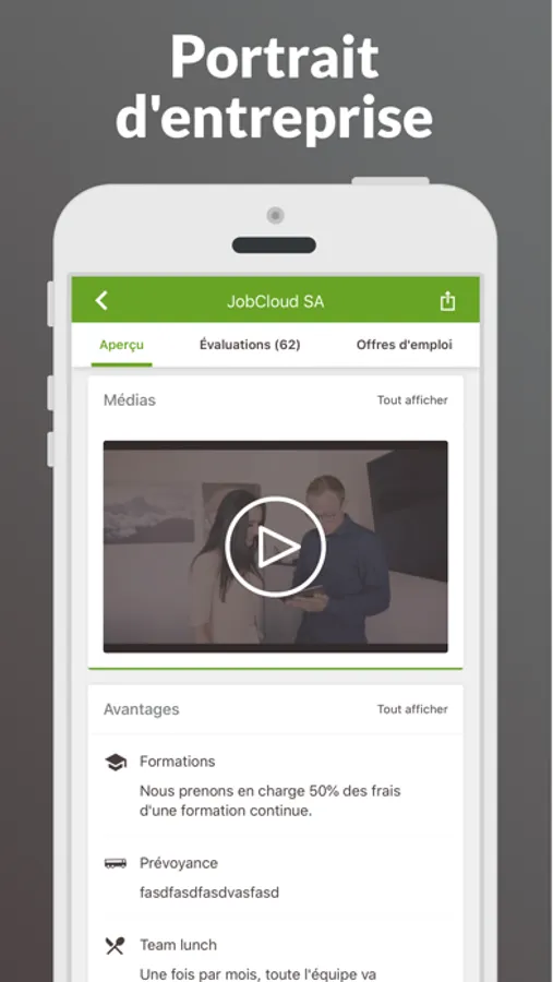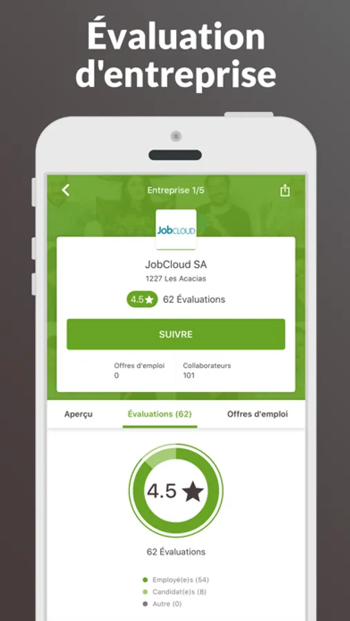 3 – RECHERCHE PAR ENTREPRISE & ÉVALUATIONS D’ENTREPRISES : Faites-vous une idée de votre prochain employeur grâce aux portraits d’entreprise. Évaluez vos employeurs ainsi que les entreprises où vous avez postulé et obtenez un aperçu du fonctionnement d’employeurs potentiels grâce aux évaluations des autres utilisateurs.