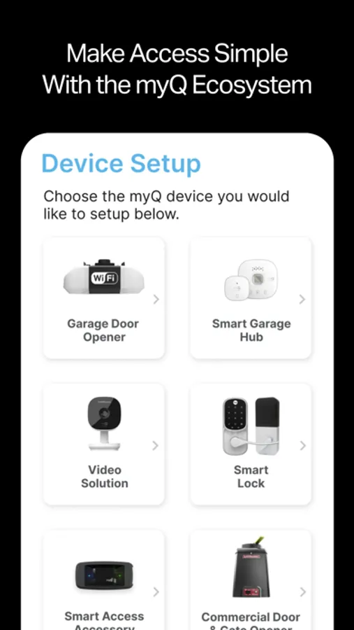 The myQ smart access app allows you to easily open, close or check the status of your garage door, commercial door, gate or myQ home lighting from anywhere using your mobile device. The myQ app supports myQ-enabled products from Chamberlain, LiftMaster.