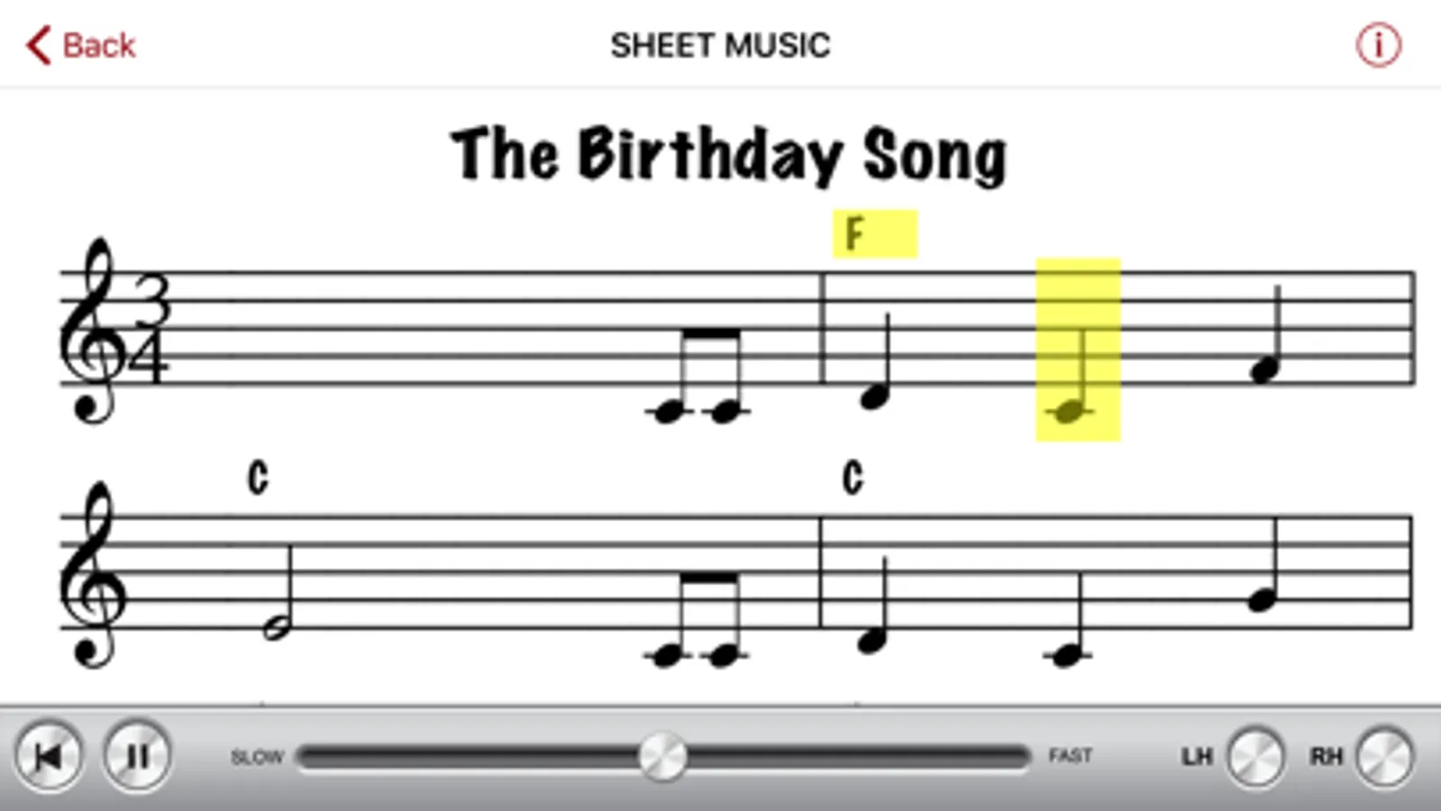 Or, if you want to learn to read notes, select “Sheet Music” from the home screen. Then, you can choose to watch a basic tutorial on reading notes, or just dive right in to the song of your choice. Speed controls are provided for controlling the playback tempo, so you can learn at your own pace.