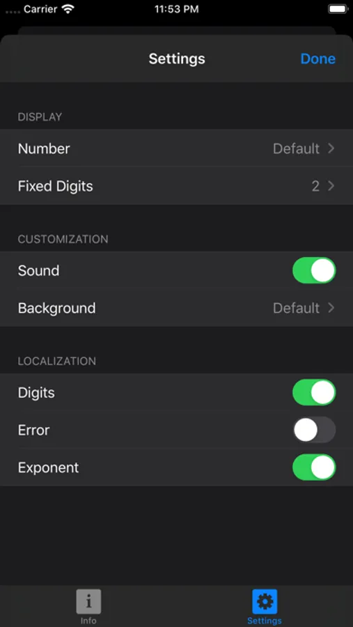 - Change number display to Fixed, Scientific, etc., by tapping on the display.