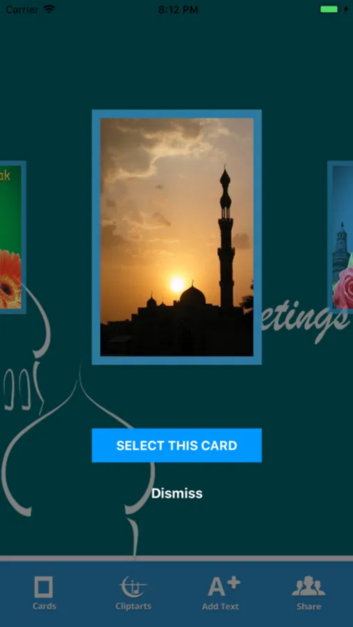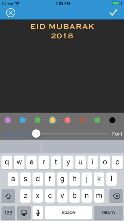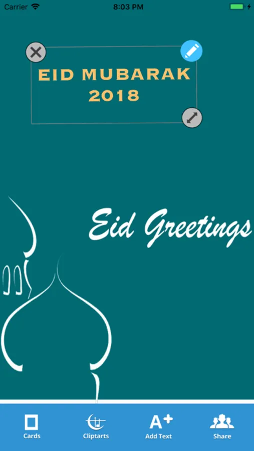 Create your custom Eid Card or Ramadan Card with this App. This app will to customize the card the way you want. You can add Text with all different font and color, change size. Add clip art, move, scale rotate clip art. add your own clipart.