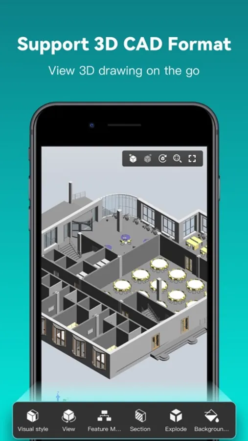 • Rotate 3D CAD drawing by touching the drawing area and moving to view the 3D mode comprehensively in 360 degrees. Click the screen to stop rotating and locate the 3D mode at the best perspective.