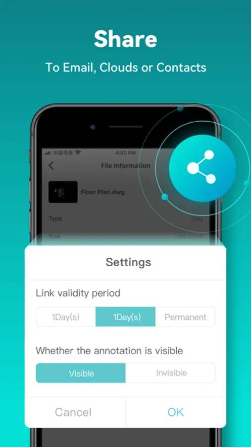 • Drawings from E-mail, Cloud Service or Network Disk like Dropbox, OneDrive, Google Drive, Box or WebDAV can be opened, viewed, edited and shared as well with Internet.
