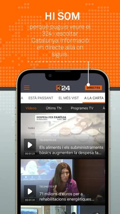L'aplicació de 324 per a iPhone i per a iPad és la millor manera d'estar informat sempre i des de qualsevol lloc: podràs mirar en directe el canal de notícies 3/24 o escoltar l'emissora de ràdio Catalunya Informació allà on siguis. També podràs accedir a les notícies, àudios i vídeos del portal 324 i rebre alertes quan tingui lloc una notícia destacada.