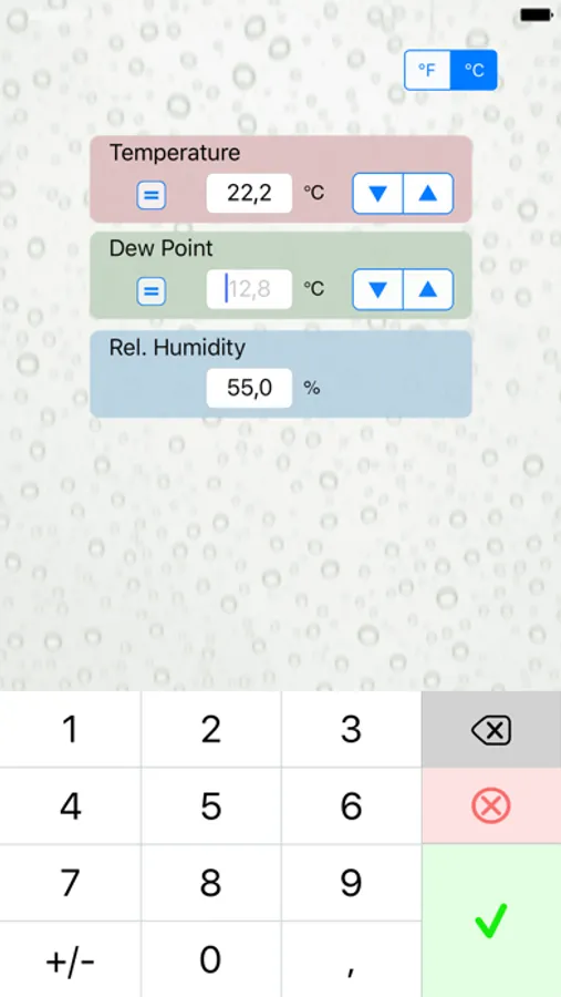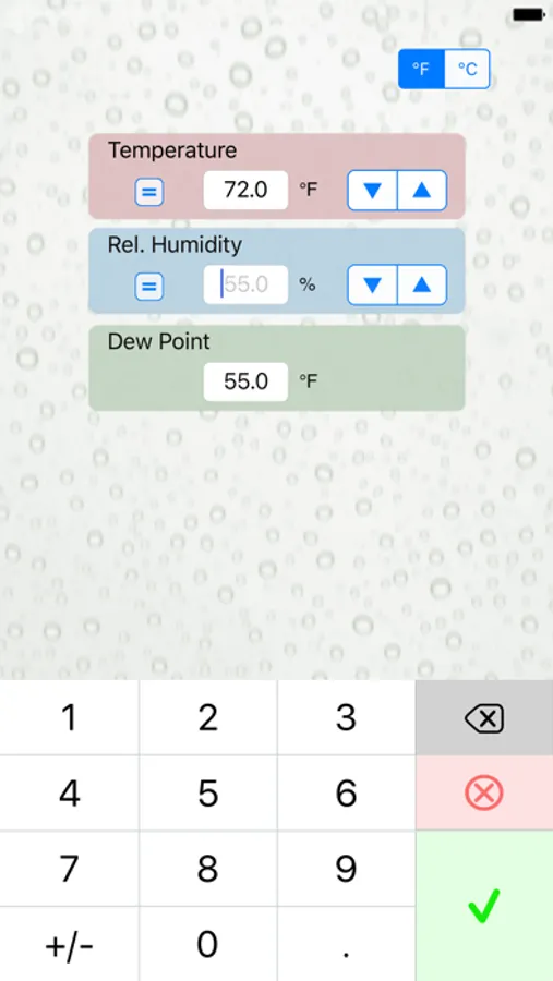 Calculate the relative humidity or dew point of the air around you. Quickly determine the dry bulb temperature (air temperature), relative humidity percentage, or dew point temperature if you know the readings of the other two. A great companion to home weather stations. Supports imperial and metric units.