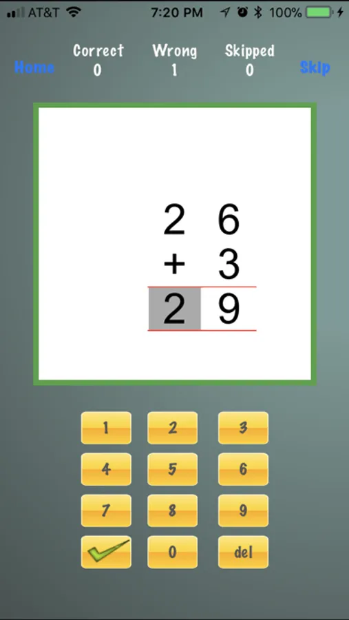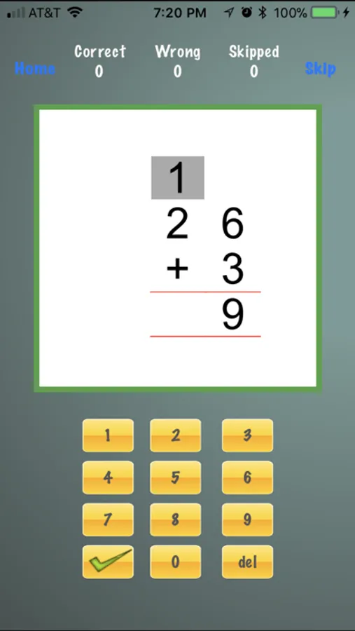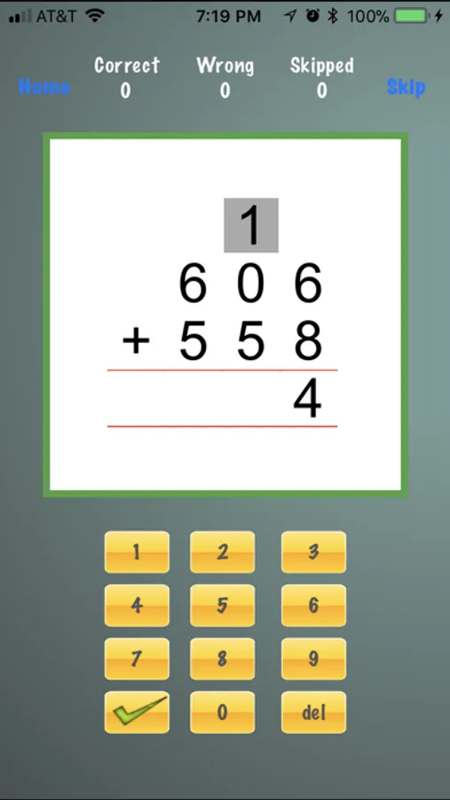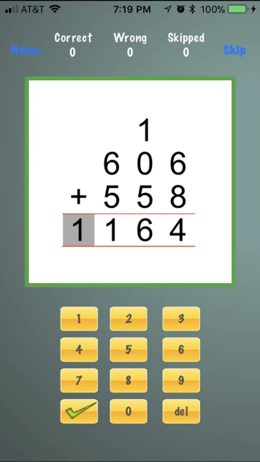 You perform the complete step by step operation needed to complete the addition and then touch the ‘Answer’ button. Once you touch the ‘Answer’ button it will check your answer, if the answer is correct the next problem will be presented, if wrong, the application will let you fix it or provide you the option to skip it.