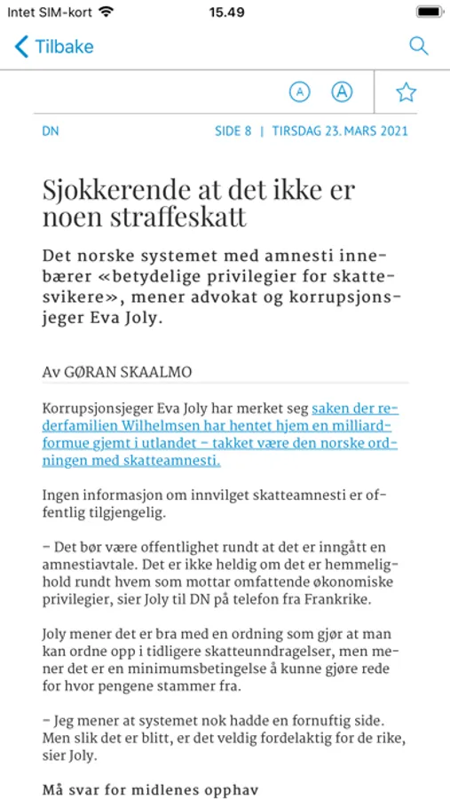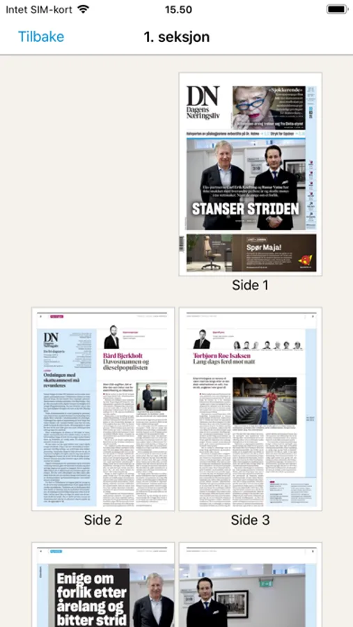 • Artikler kan leses på sidene (zoom) eller i tekstvisning. Trykk på en artikkel på en side for å få opp tekstvisningen og sveip deg videre til neste artikkel.