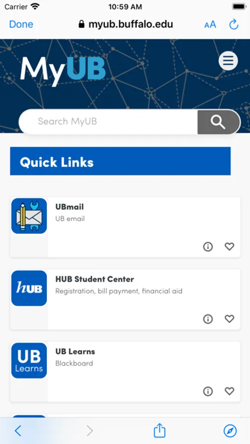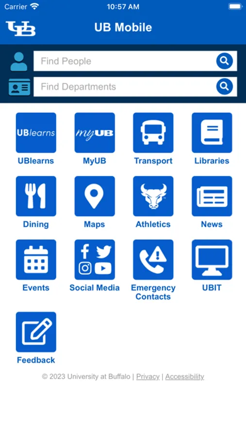 It’s UB at your fingertips. Search UB, find people and departments, access MyUB, manage courses, get the latest UB news, event listings and Bulls scores, along with access to library resources, campus maps and transportation information, including bus and shuttle schedules and parking details.