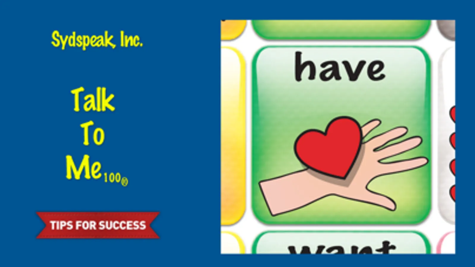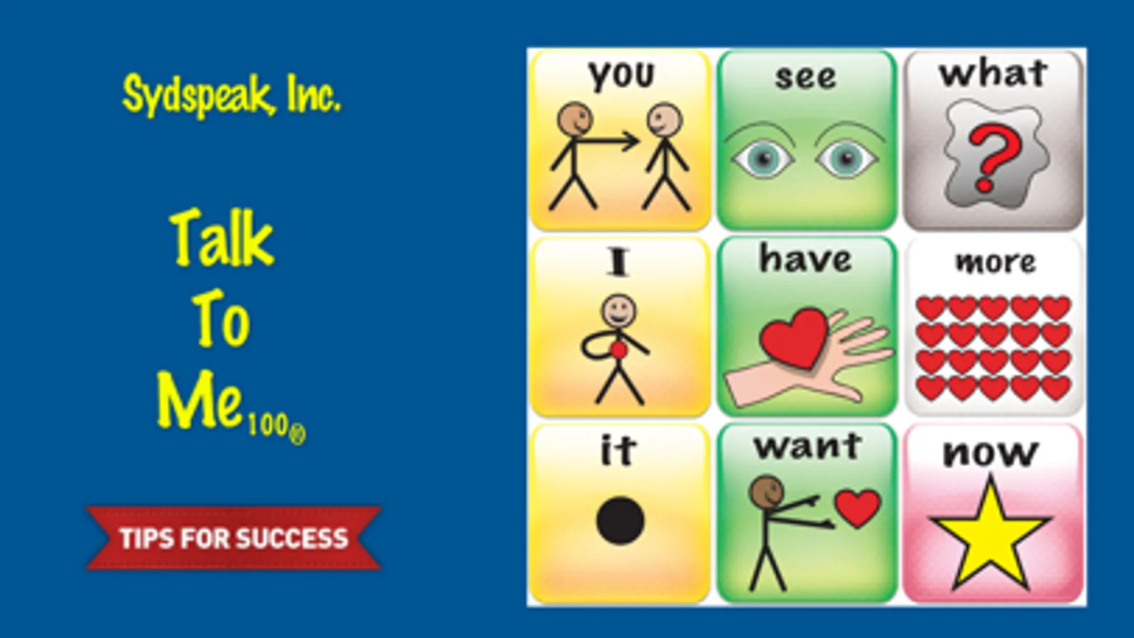 Talk To Me 100 is designed to provide communication partners with 100 words organized in a predictable format to use in an unlimited choice of daily activities. Sydspeak created this app for children with autism spectrum disorders, Down syndrome, intellectual disabilities, speech and language disorders and other special needs. Talk To Me 100 provides communication partners with a core vocabulary to begin verbal expression for all functions of language: imitate, comment, answer, question, describe, retell, accept, reject, repeat, command, request, explain, persuade, maintain social relationship and influence.