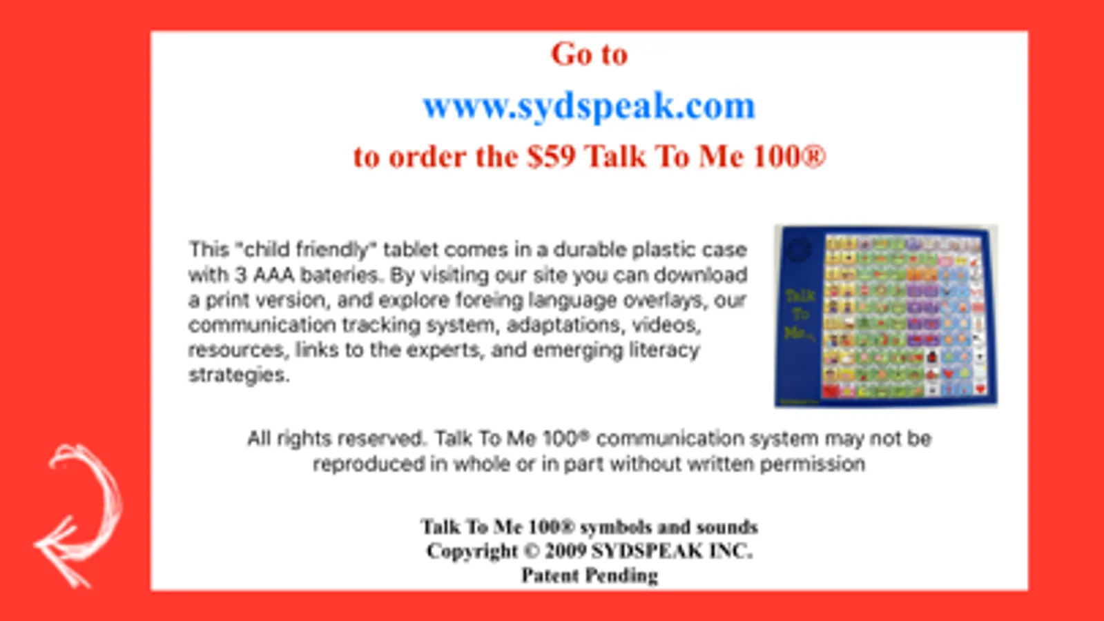 This iPad app is a digital replica and companion to the original “child friendly” Talk To Me 100® available at www.sydspeak.com. Priced at $59, this tablet is similar in size and comes in a durable plastic case with 3AAA batteries. Research shows that when each communication partner uses their own personal voice output device, language acquisition is more efficient. For some children, a predictable pattern of images on a computer screen using the same child’s voice has more impact than pictures on paper with changing adult verbal interactions. For the first time, we now have a powerful communication system where both partners can have their own affordable and effective language device with the same voice and symbols.