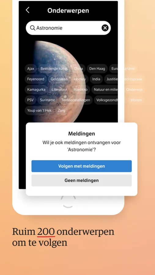 Je kunt onderwerpen volgen bij NRC om een persoonlijk nieuwsoverzicht te creëren. Er worden onderaan elk artikel passende onderwerpen voorgesteld om te volgen. Bijvoorbeeld: Amerikaanse politiek of kunstmatige intelligentie. Ook andere nieuwsthema’s, columnisten en rubrieken vind je terug in de app. Volg je een aantal onderwerpen, dan ontstaat in de ‘Mijn Nieuws’-sectie een persoonlijke bundel met verhalen. Je kan ook notificaties instellen voor jouw onderwerpen.