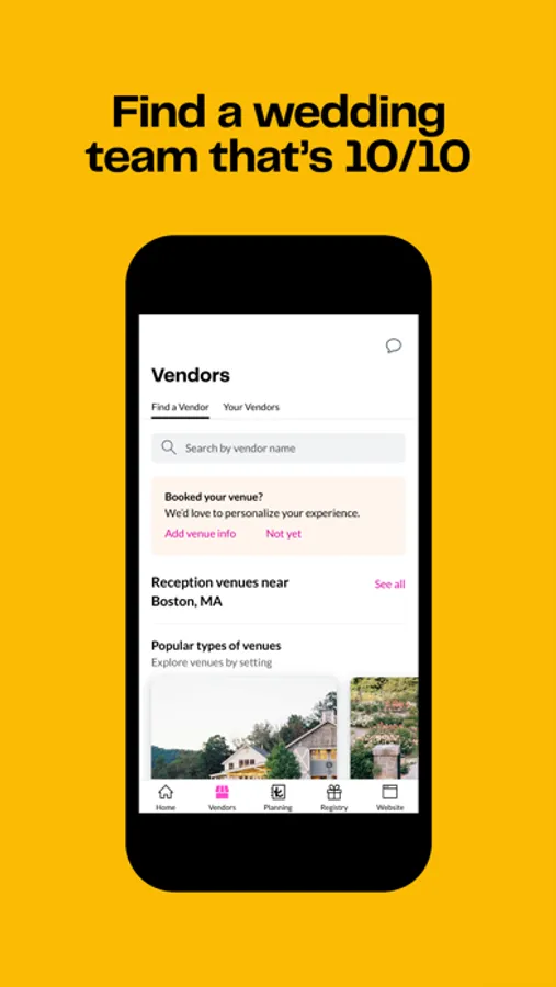 Wedding Vendors: Find the best local vendors and wedding venues who can bring your day to life. Read reviews and contact vendors right from the app.