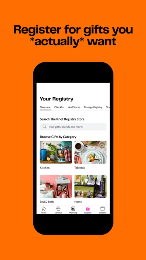 Wedding Registry: The registry you and your guests will love. Easily add gifts from The Knot Registry Store (or anywhere else!), gift cards, honeymoon funds, experiences, cash funds and more. It’s the only registry that automatically syncs your registry gifts from top retailers directly to your wedding website. Plus, free shipping and returns from The Knot Registry Store and a post-wedding discount.