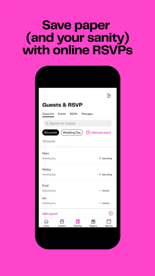 Wedding Guest List & RSVPs: Get everything you need to manage and talk to guests—from easy address collection to automatic RSVP tracking.