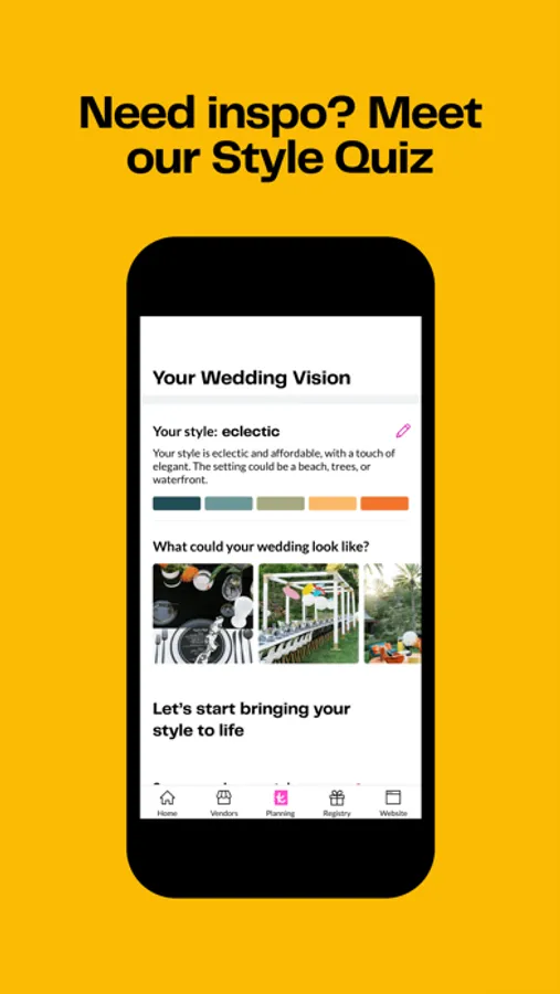 Wedding Vision: Take the Style Quiz to get personalized style, colors and decor ideas. Include your favorite bride, groom and wedding party looks on your inspiration board. Add more photos from your phone or computer, then send to your list of recommended vendors in a click.