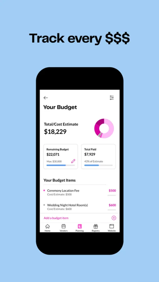 Wedding Budgeter: Set your wedding budget and we’ll do the math for you. See estimated costs for each vendor based on your overall budget and keep your spending on track.