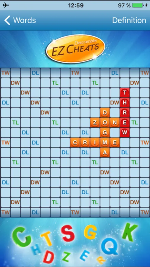 An ad-free, smart cheat app for Scrabble® and Words with friends. We automatically input the board and find the best moves for you! Now you can cheat or play jokes on your friends by making 80 point moves, or improve your skills using the built-in dictionary and anagram finder. It is free, so there’s no risk for you – go ahead and try it, you’ll love it!