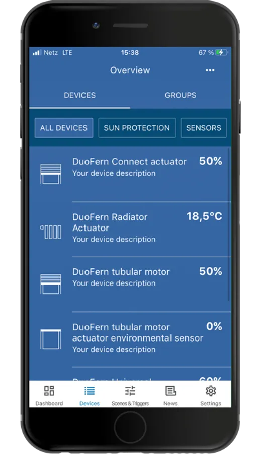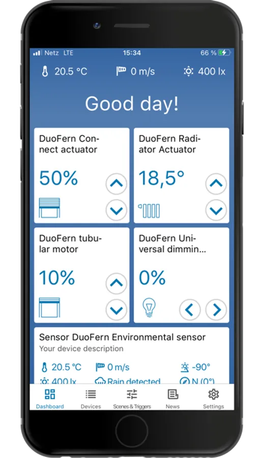 With the Rademacher App, your integrated DuoFern devices can be conveniently controlled via smartphone or tablet - from home or on the go.