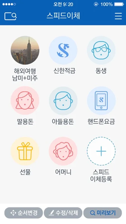 - 자주쓰는 이체정보(입금/출금계좌,금액,통장메모 등)을 설정