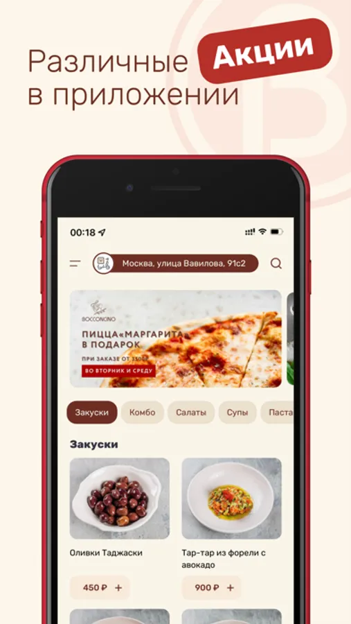 Аппетитная пицца из настоящей дровяной печи, а также итальянские закуски и салаты, паста и ризотто, мясные и рыбные деликатесы, словом – всё то, за что мы знаем и любим Bocconcino, теперь можно заказать домой и в офис! С помощью нашего приложения заказать любимую пиццу от Bocconcino можно где угодно, и для этого необязательно звонить в Службу доставки. К Вашим услугам – подробное иллюстрированное меню с возможностью заказа доставки или самовывоза.