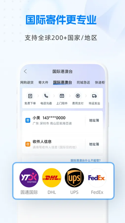 支持市面知名快递公司,如FEDEX、DHL、圆通国际、顺丰国际、邮政国际、极兔国际等。支持全球200+个国家及地区邮寄,清关高效,专业顾问全程1v1服务。