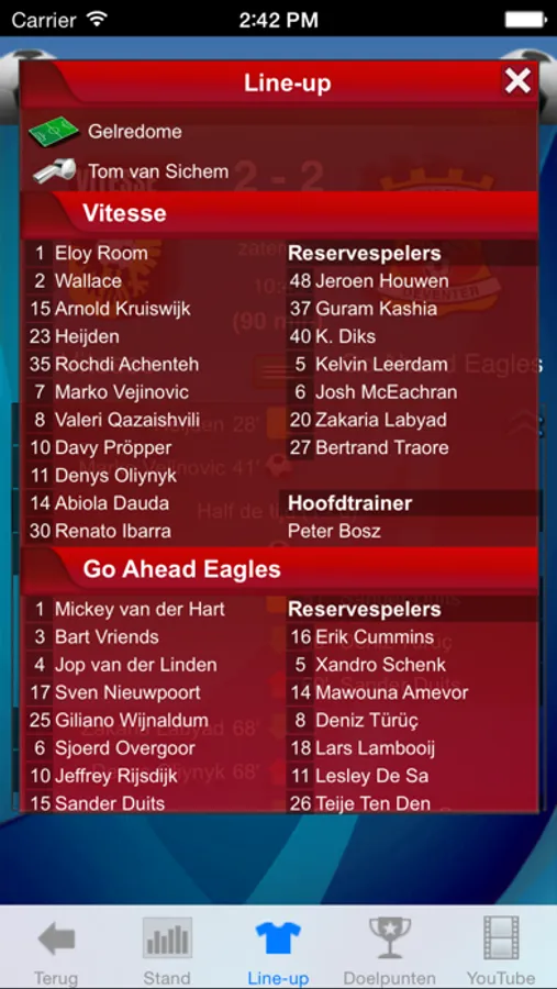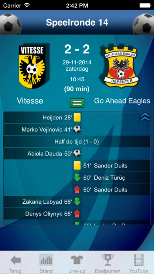 Live speel details (Rode/Gele Kaarten, substitutes …)