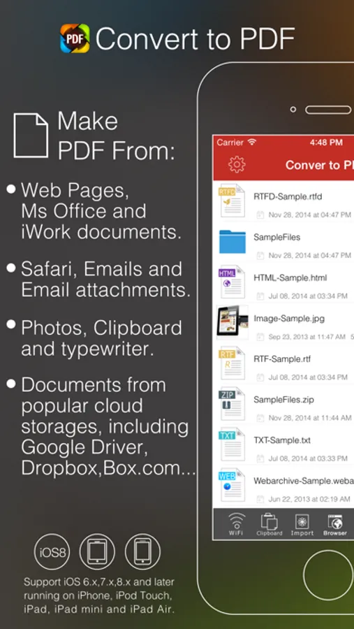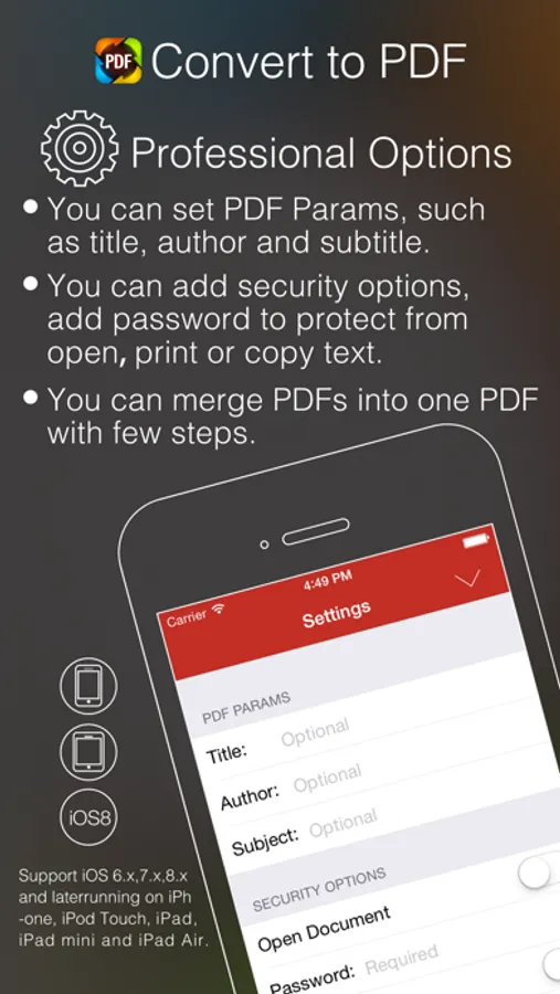 Convert to PDF Pro is an application which allows converting Word, Excel, PowerPoint, Pages, Numbers, Keynote files, HTML pages and Photos to PDF format.