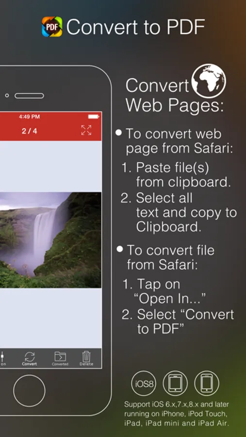 You can easily convert web pages from safari or email content and attachments from mail app.