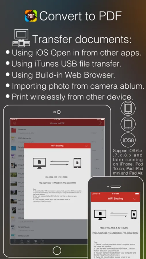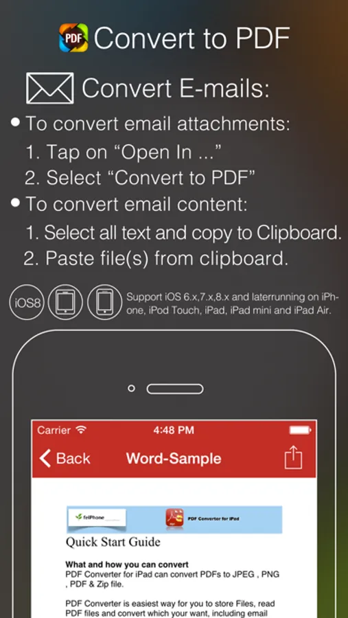 The converted PDF files could be opened in iBooks, GoodReader or Adobe Reader app for best reading experience. Also, you can send PDFs by e-mail, open in other apps and even transfer to computer.