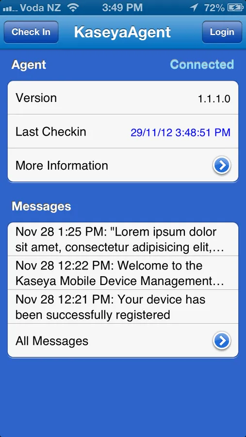 Kaseya Agent extends the reach of the Kaseya IT systems management platform to mobile phone and tablet devices and provides IT professionals with remote management and security visibility to ensure IT policies and best practices are followed.
