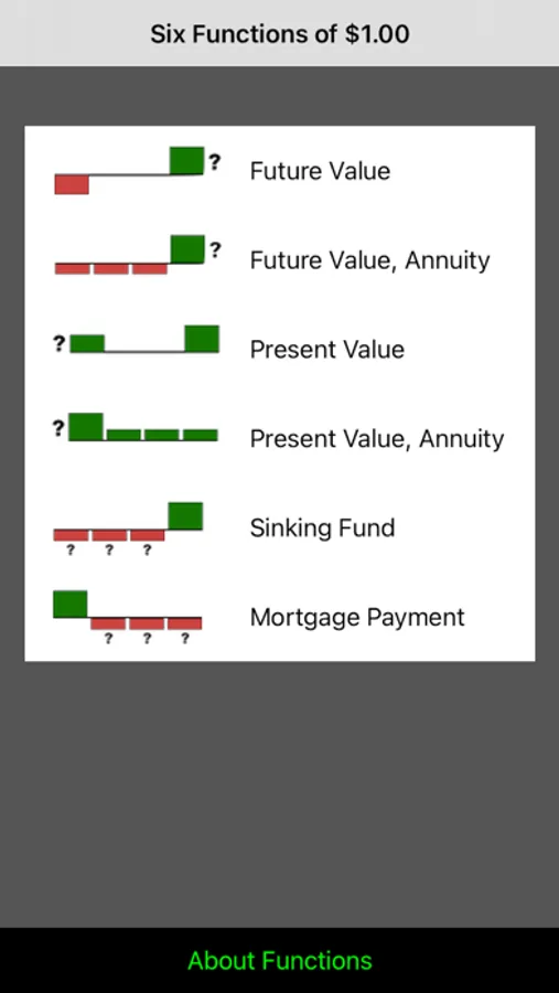 Six Functions of a $1 is a suite of financial calculations commonly used in finance, economics, investment analysis, and valuation. These functions are especially useful to students learning about time value of money concepts.