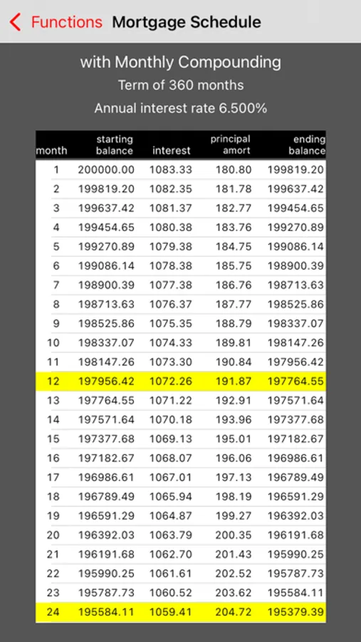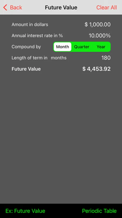 Once a computation has been performed for a particular term, you can access a "periodic table" that displays the calculated results for all periods up to the term so you can see how the results will vary over time.