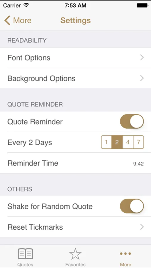 * EASY NAVIGATION (swipe right/left for another quote; shake for random quote)