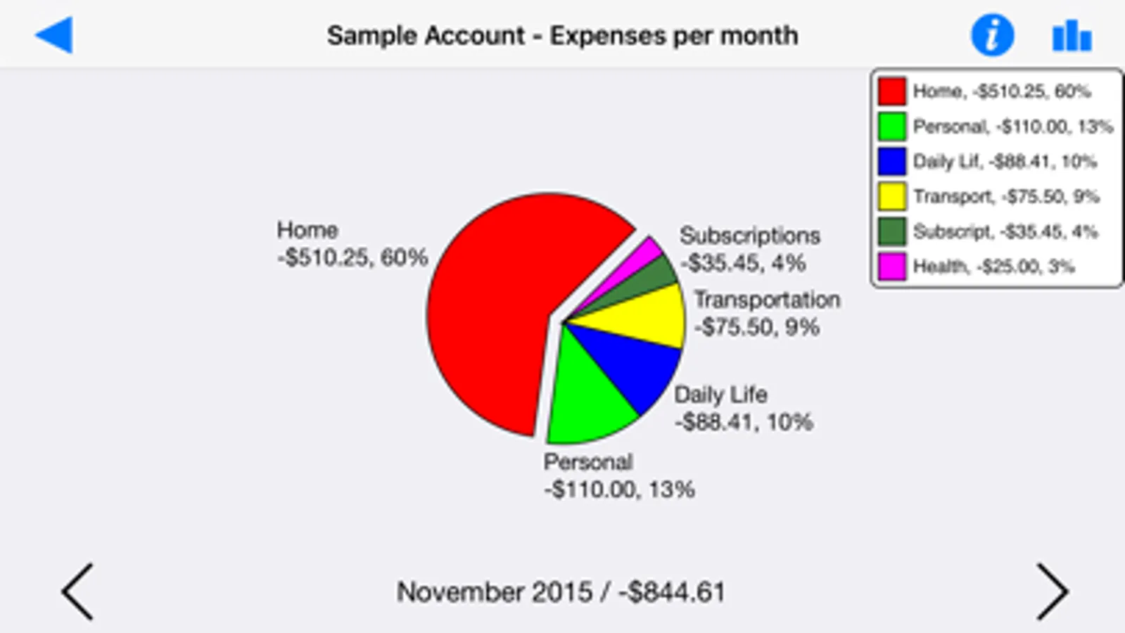 Several graphs (bar or pie charts) provided by the application give you a clear and synthetic view of your transactions and their breakdown into expense, income, category and budgetary changes.